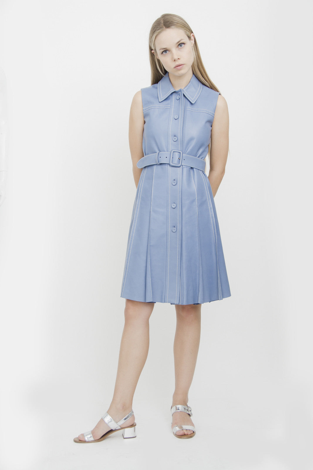 PRADA BLUE LEATHER SHIRT DRESS
