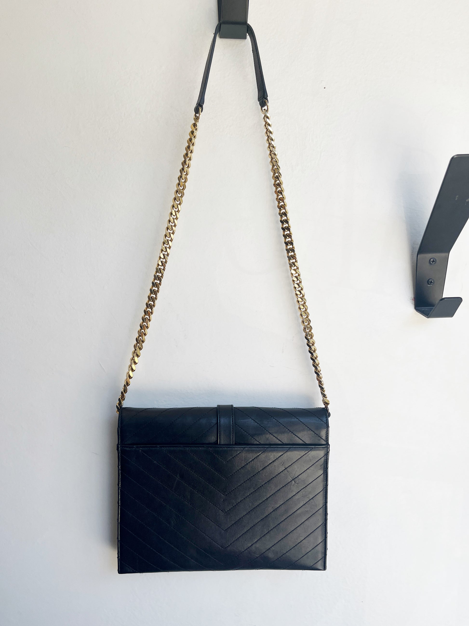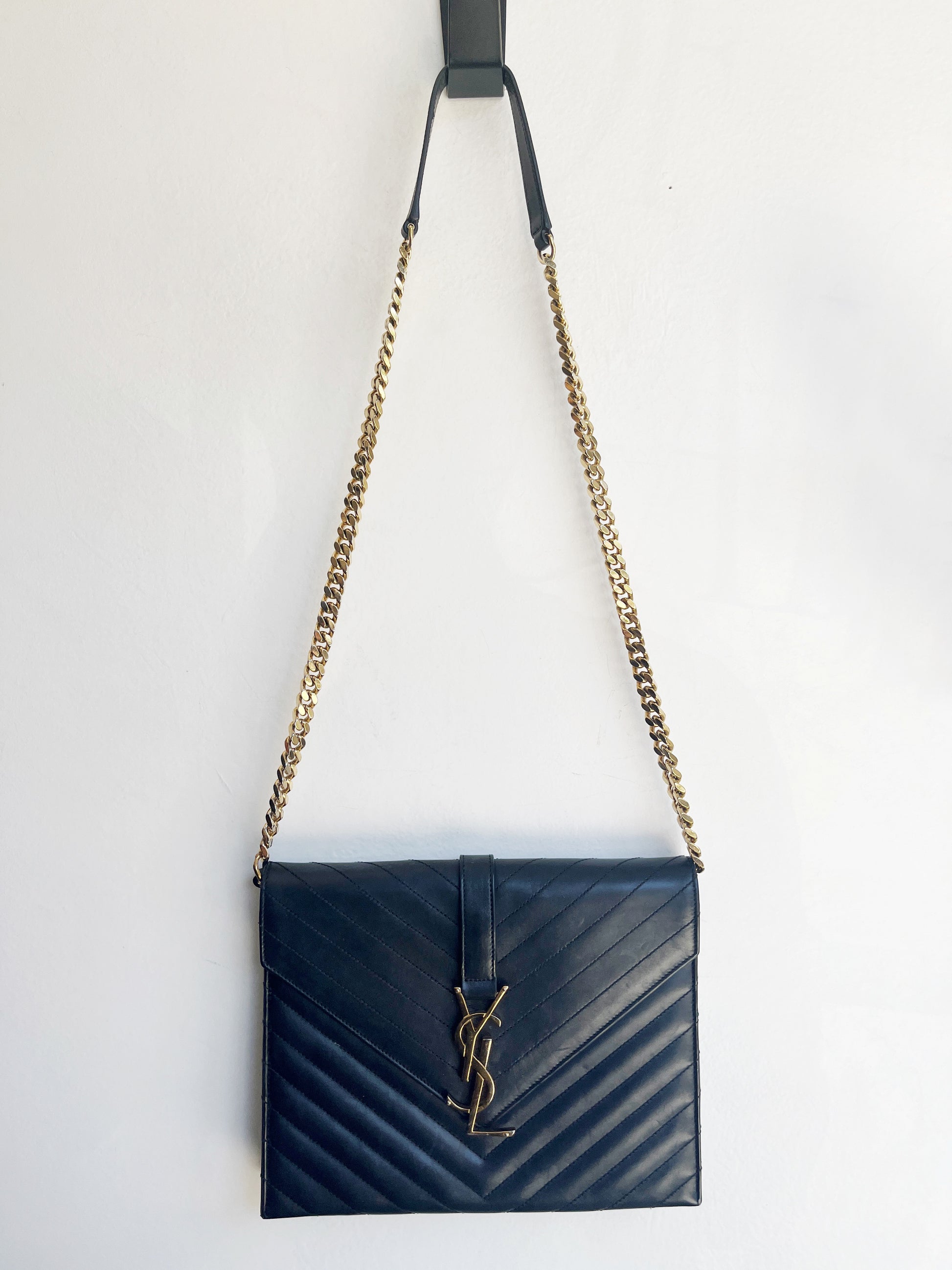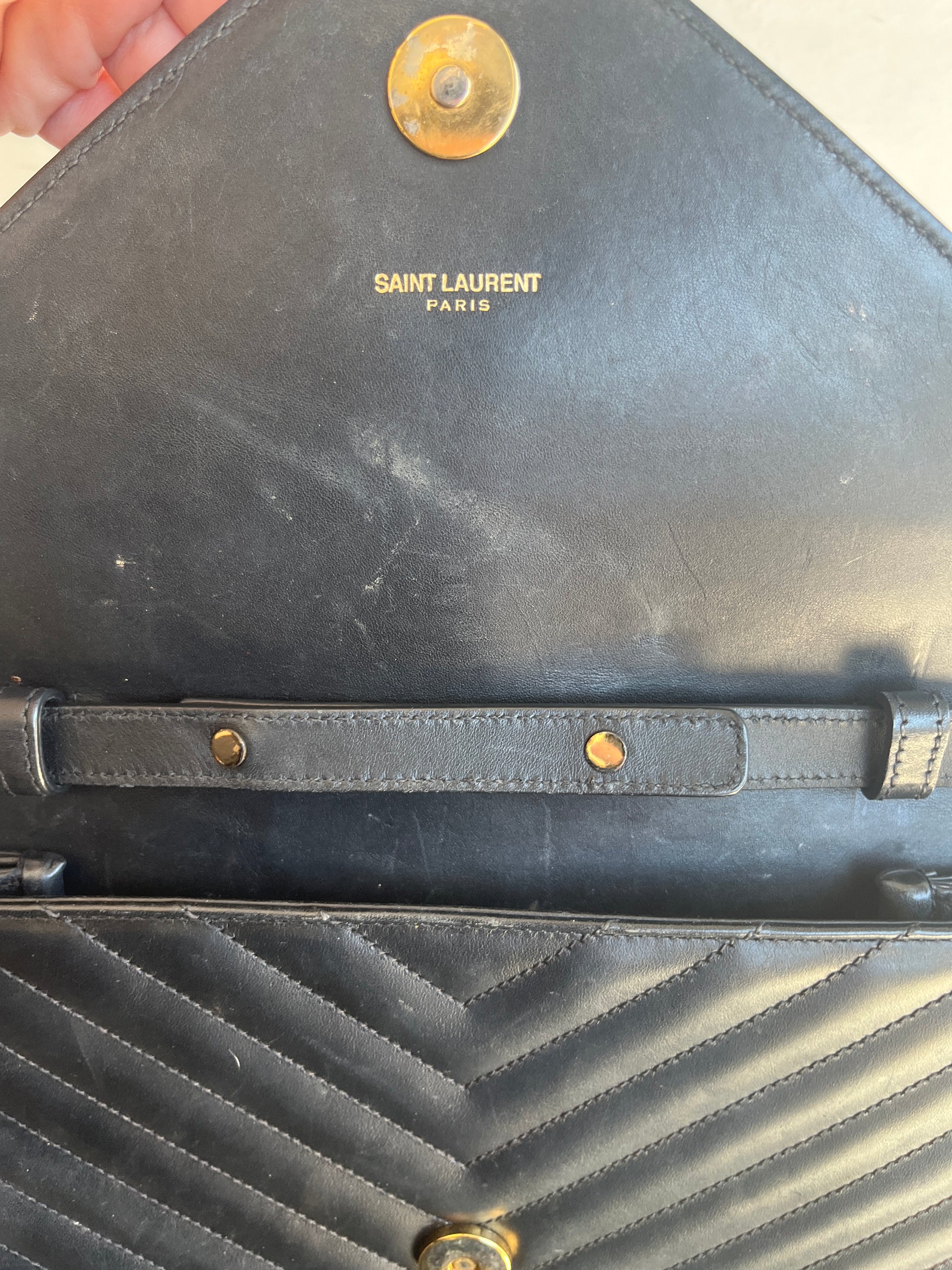 Cross over strap secures with a prominent gold tone YSL monogram detail