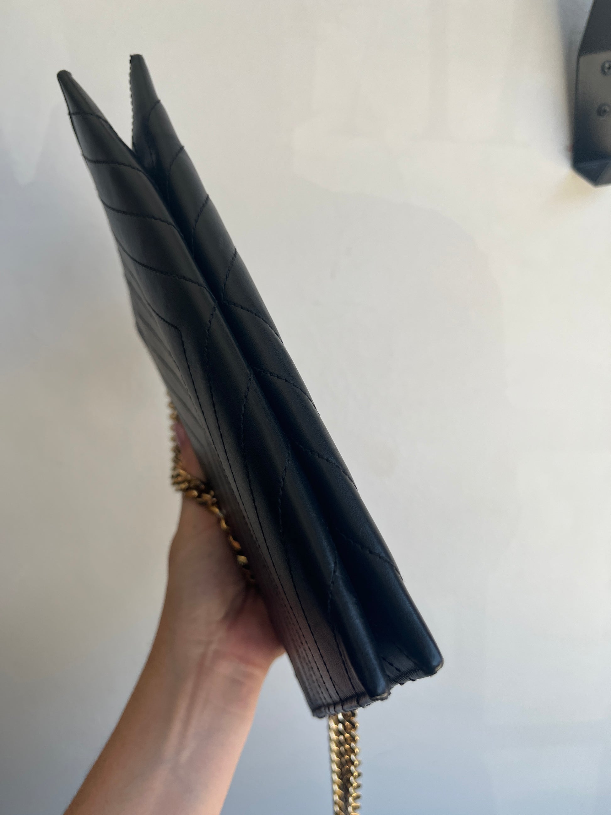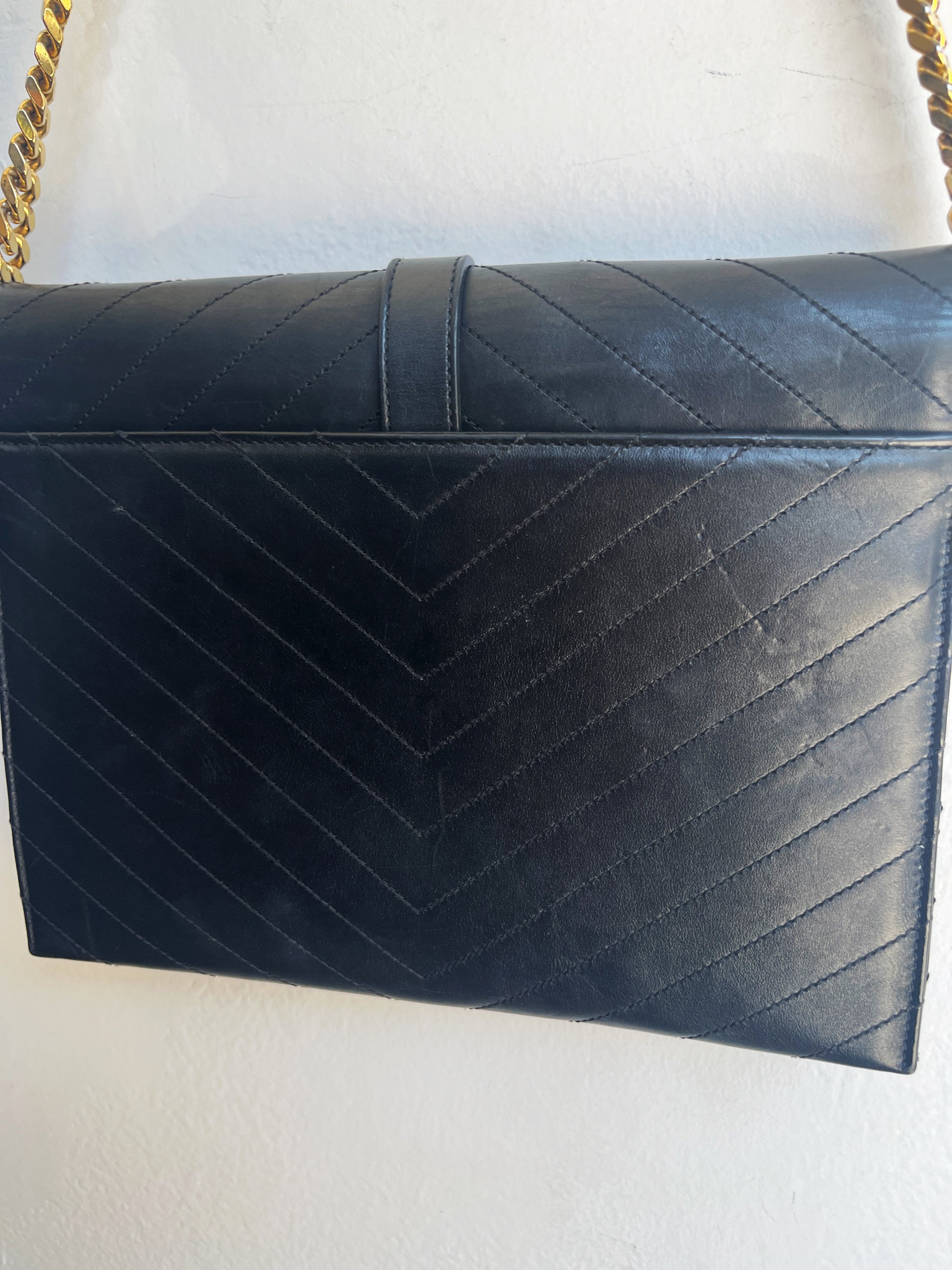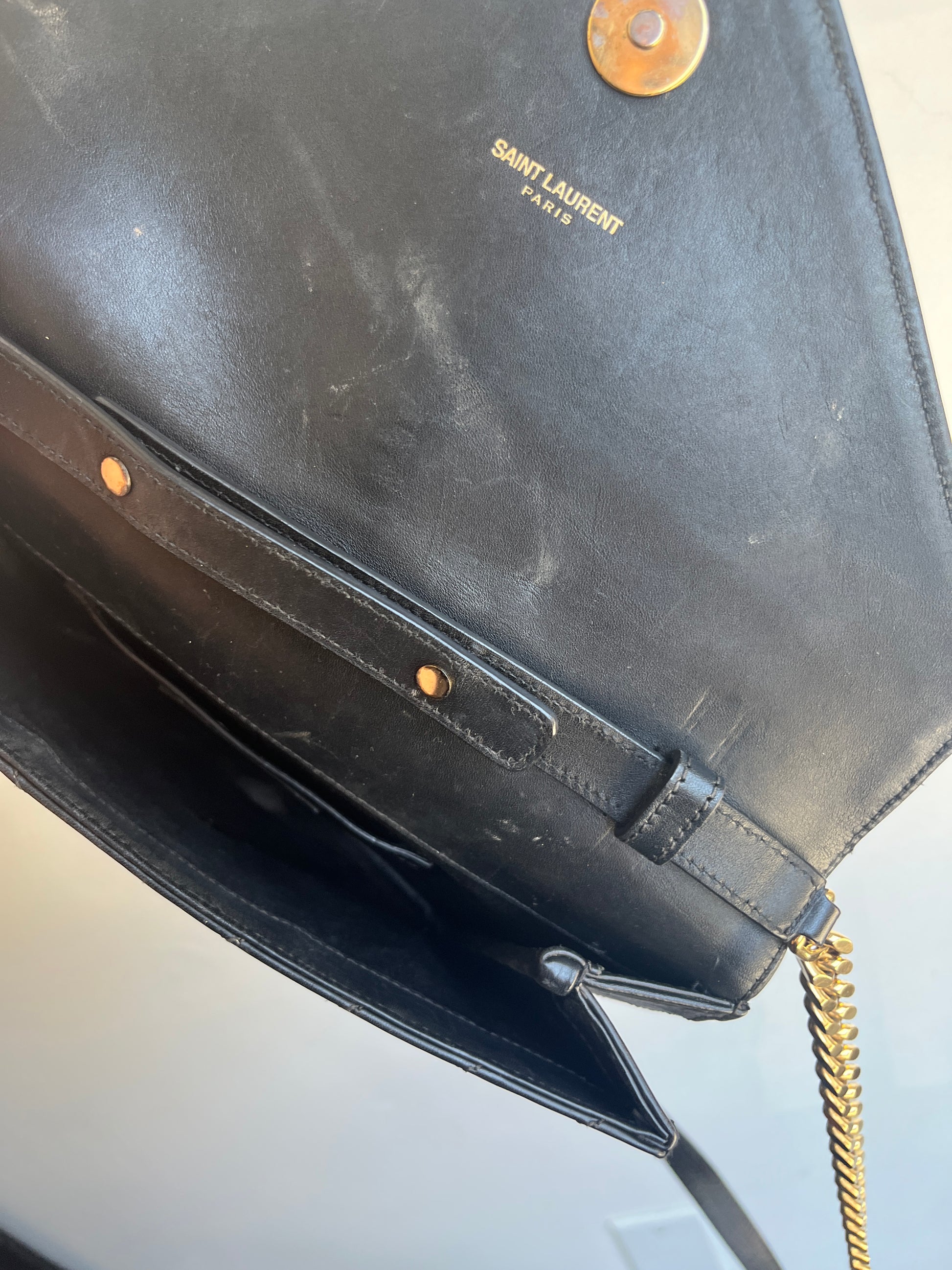 Cross over strap secures with a prominent gold tone YSL monogram detail