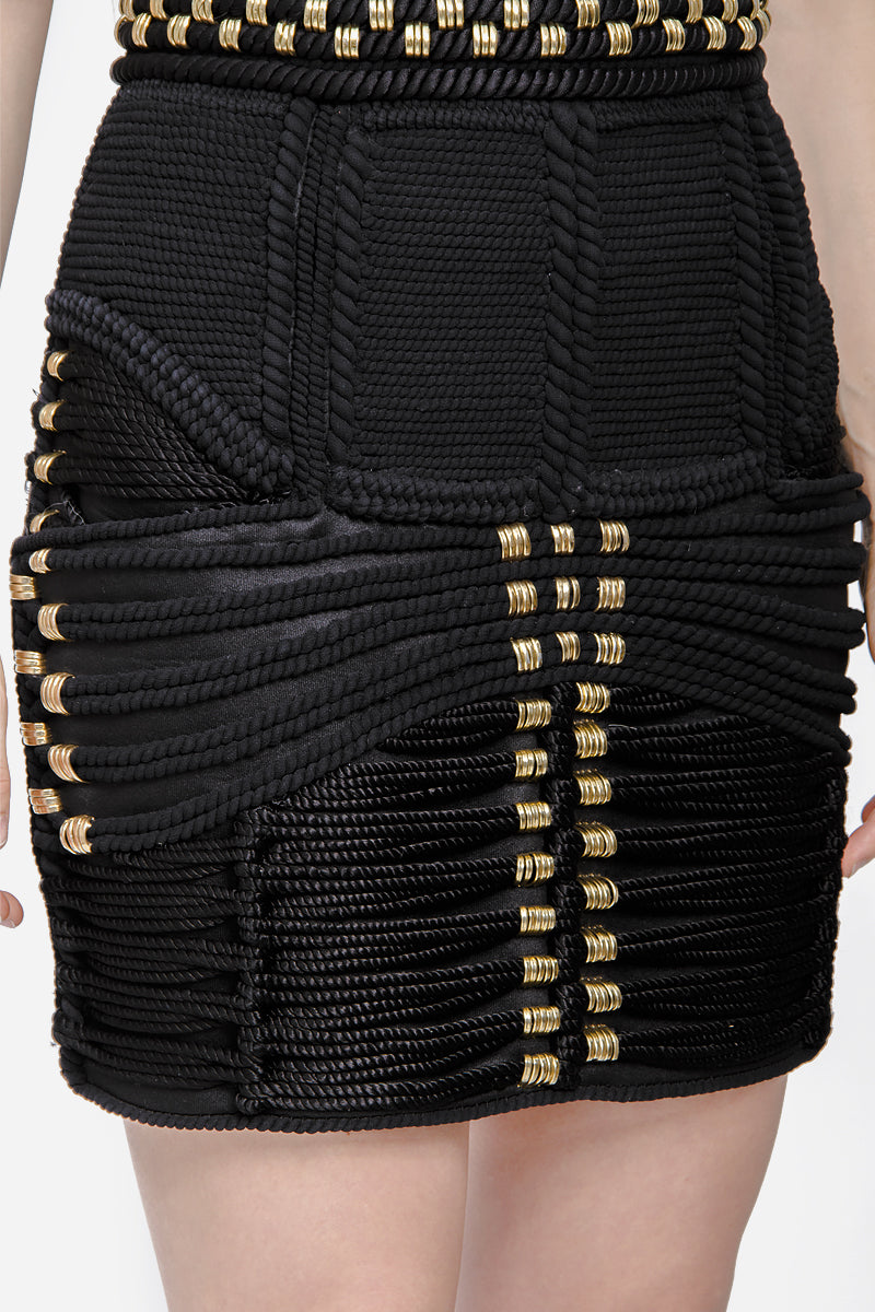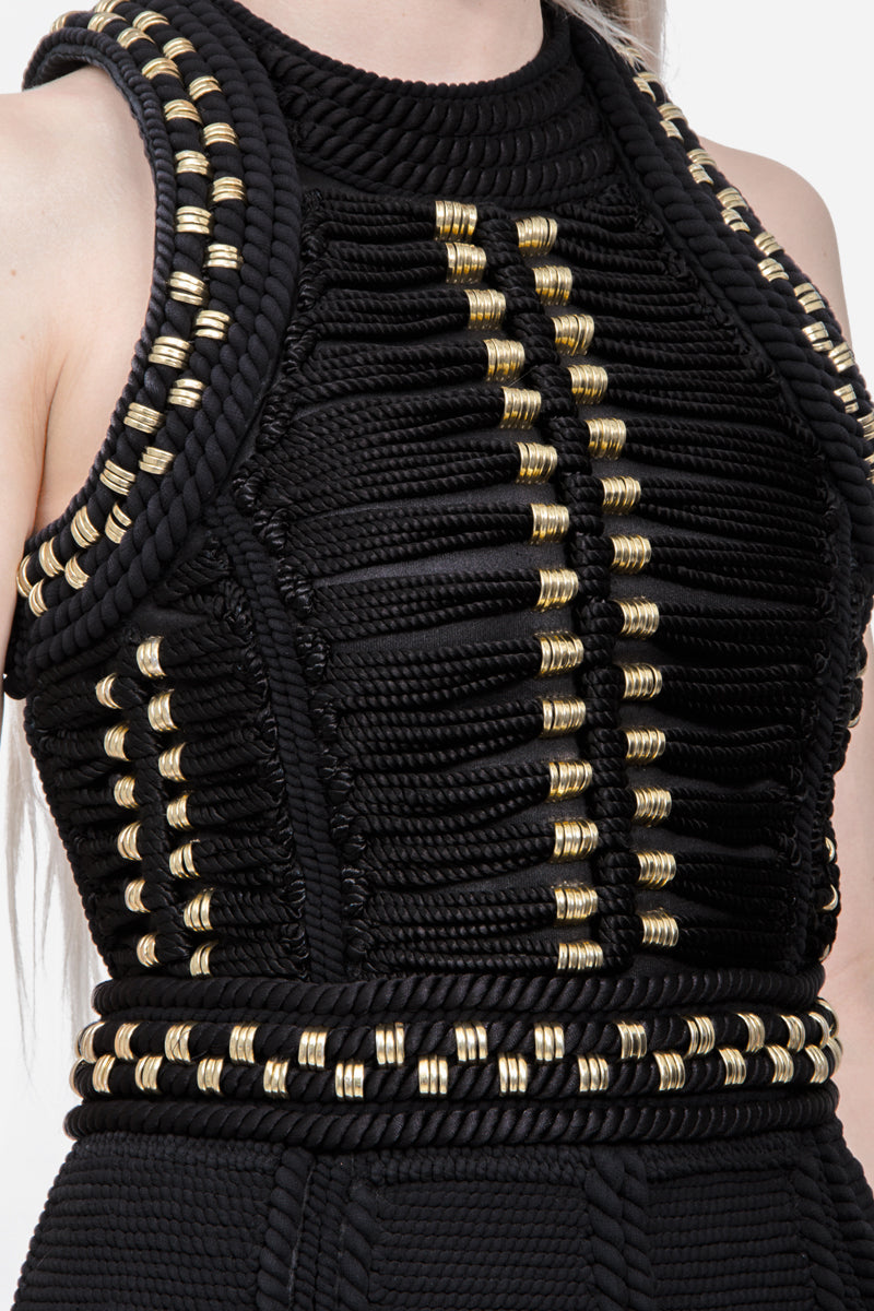 Black woven cord embellished with gold-tone metal beads. Round neck