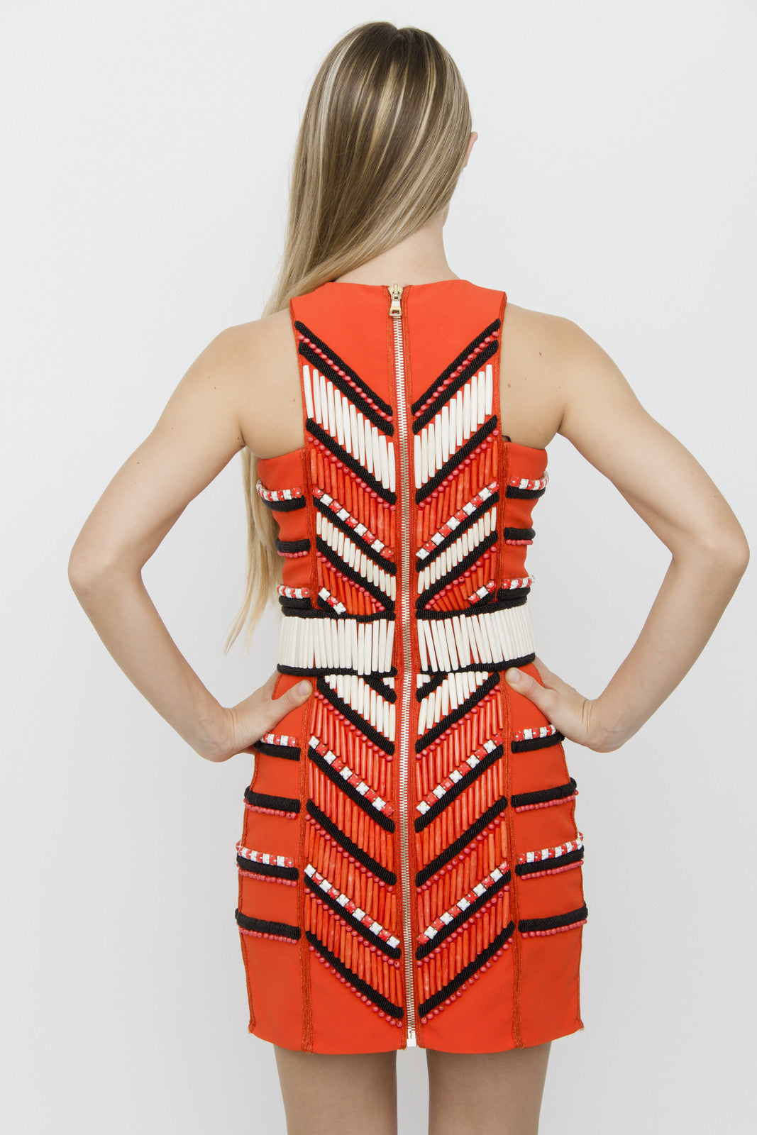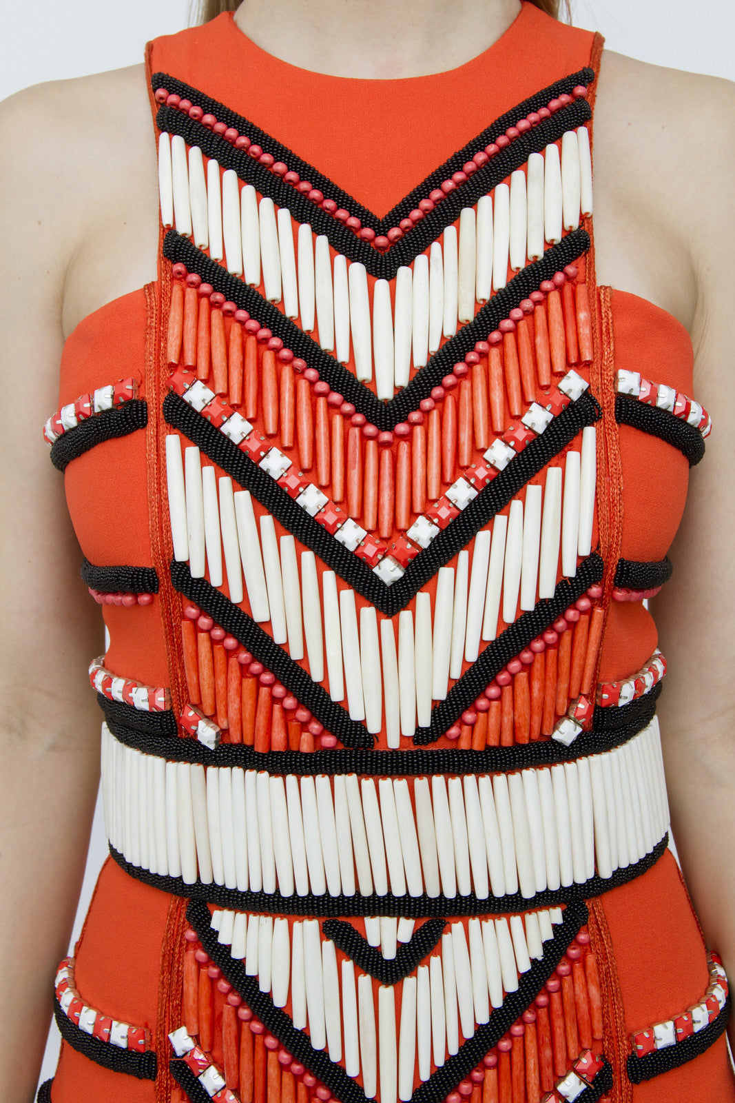 Embellished with beads and bone in a graphic pattern
