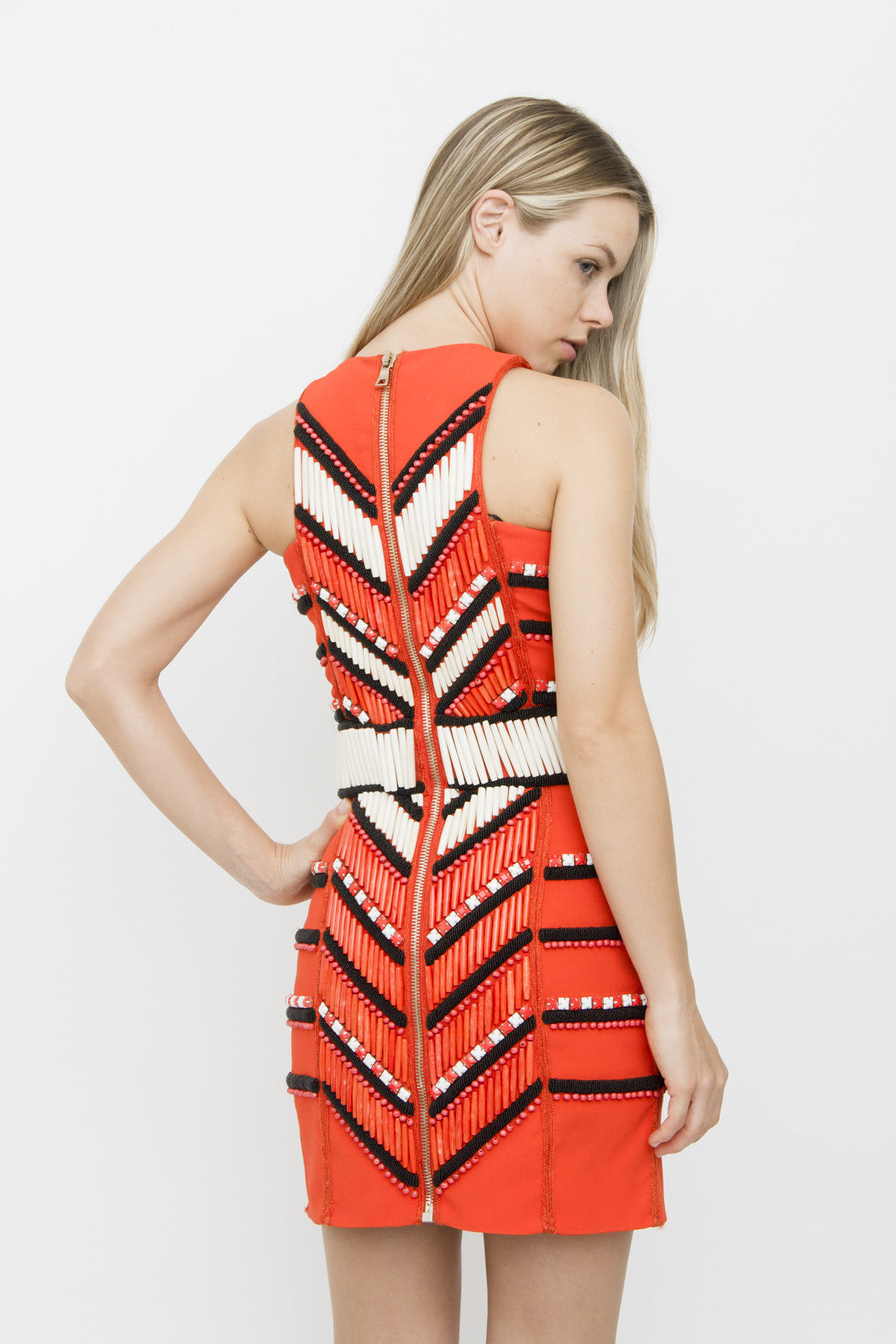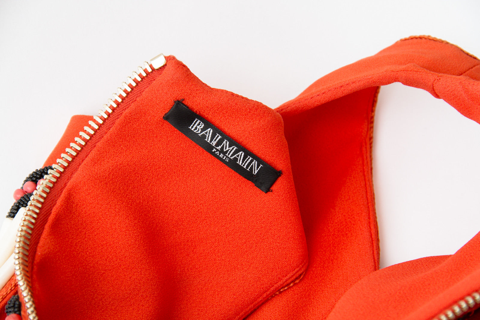 BALMAIN RED EMBELLISHED BEADED CREPE DRESS