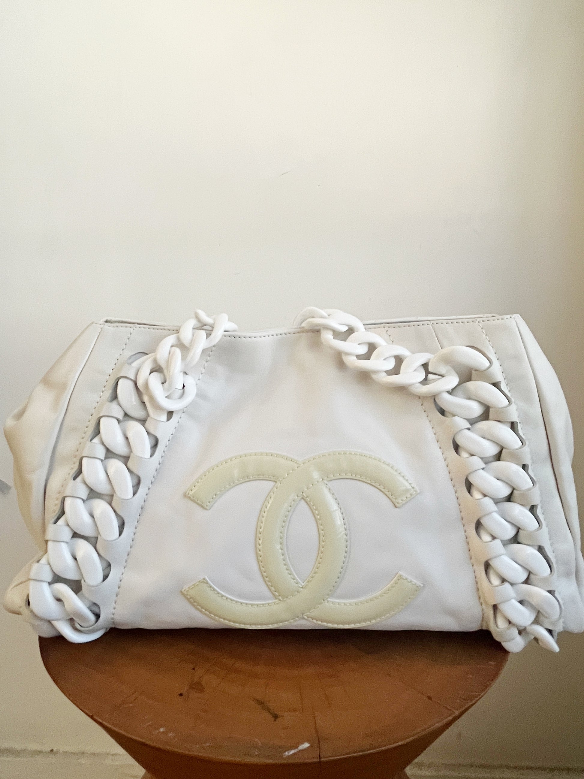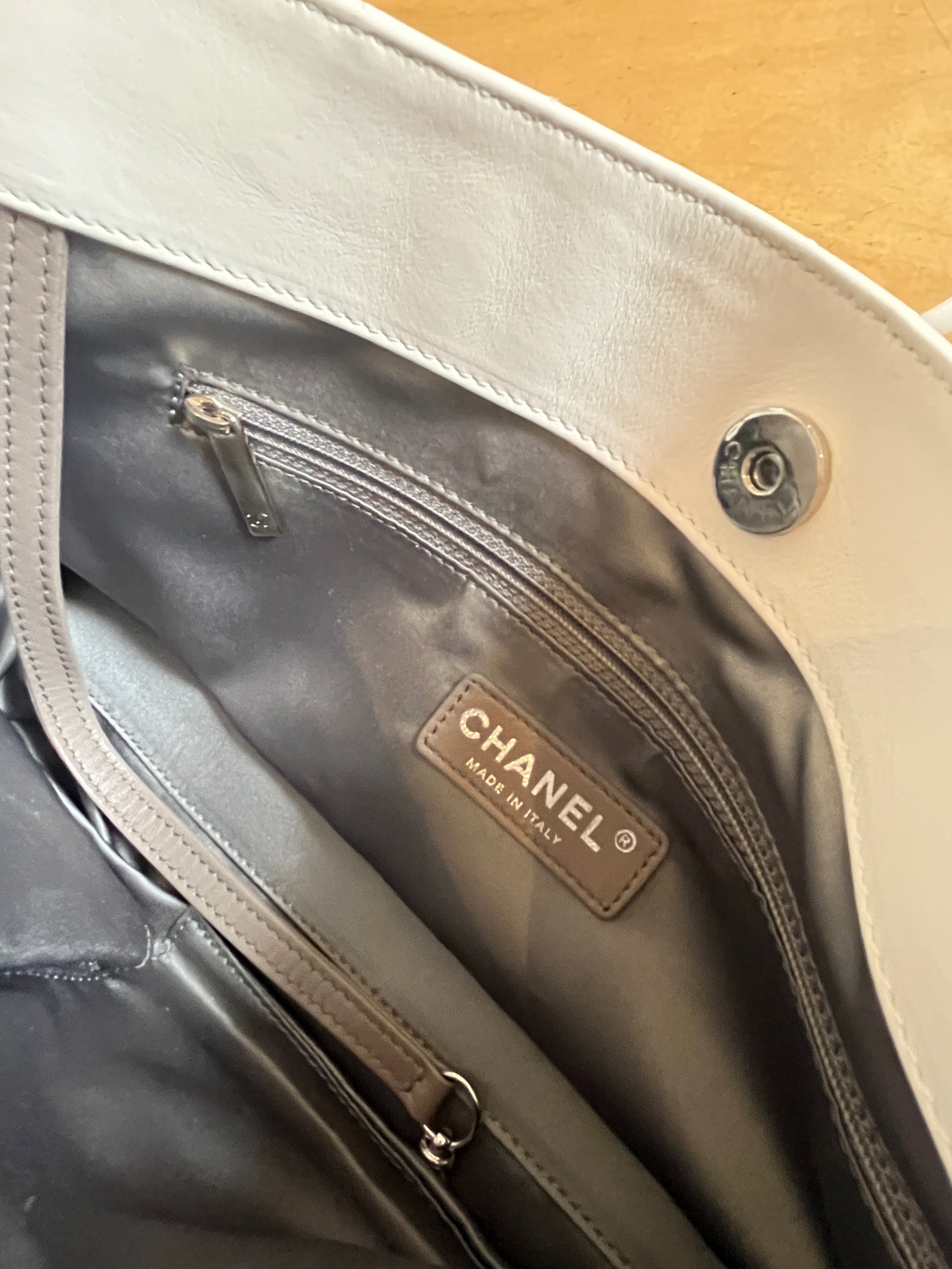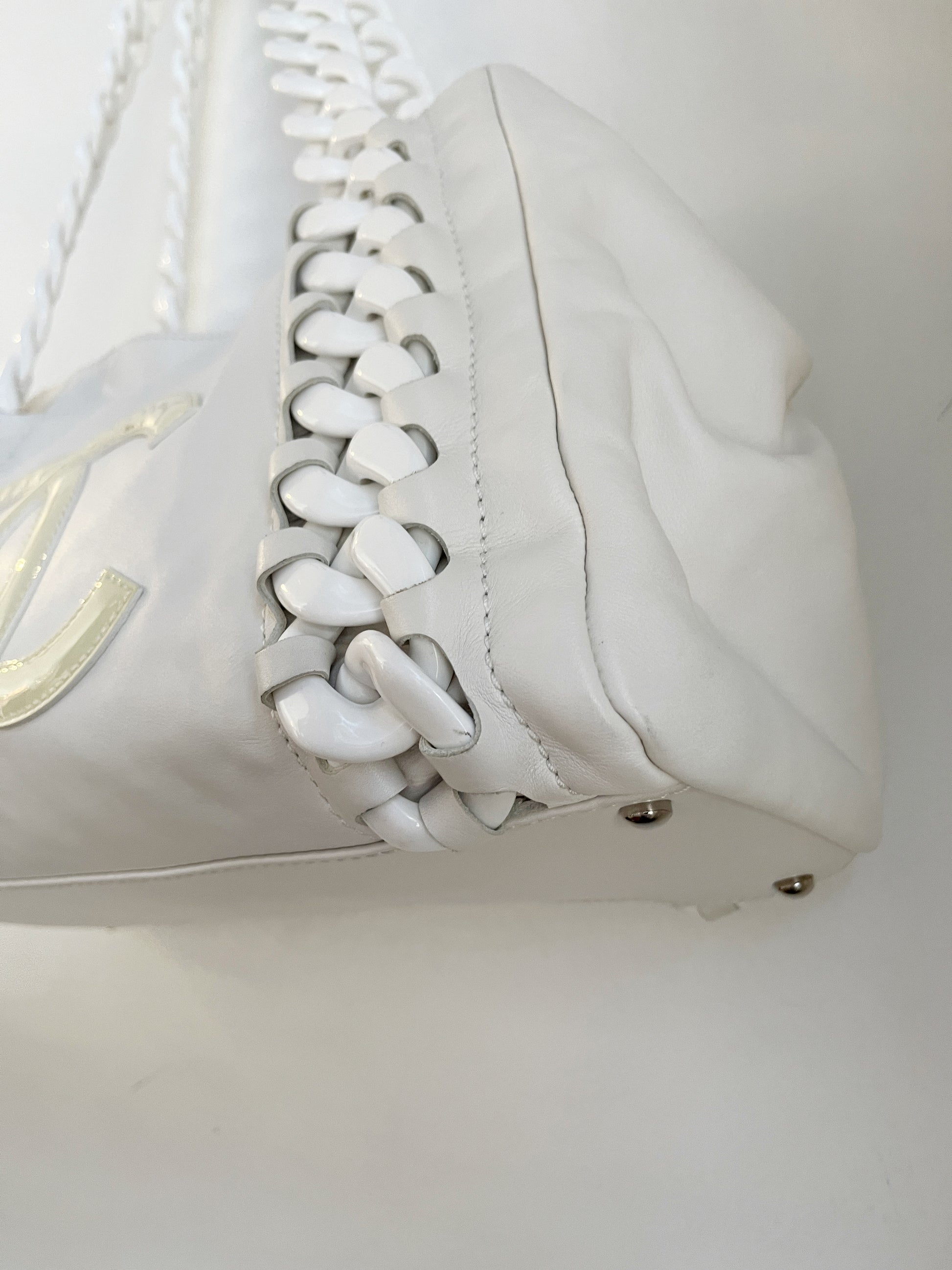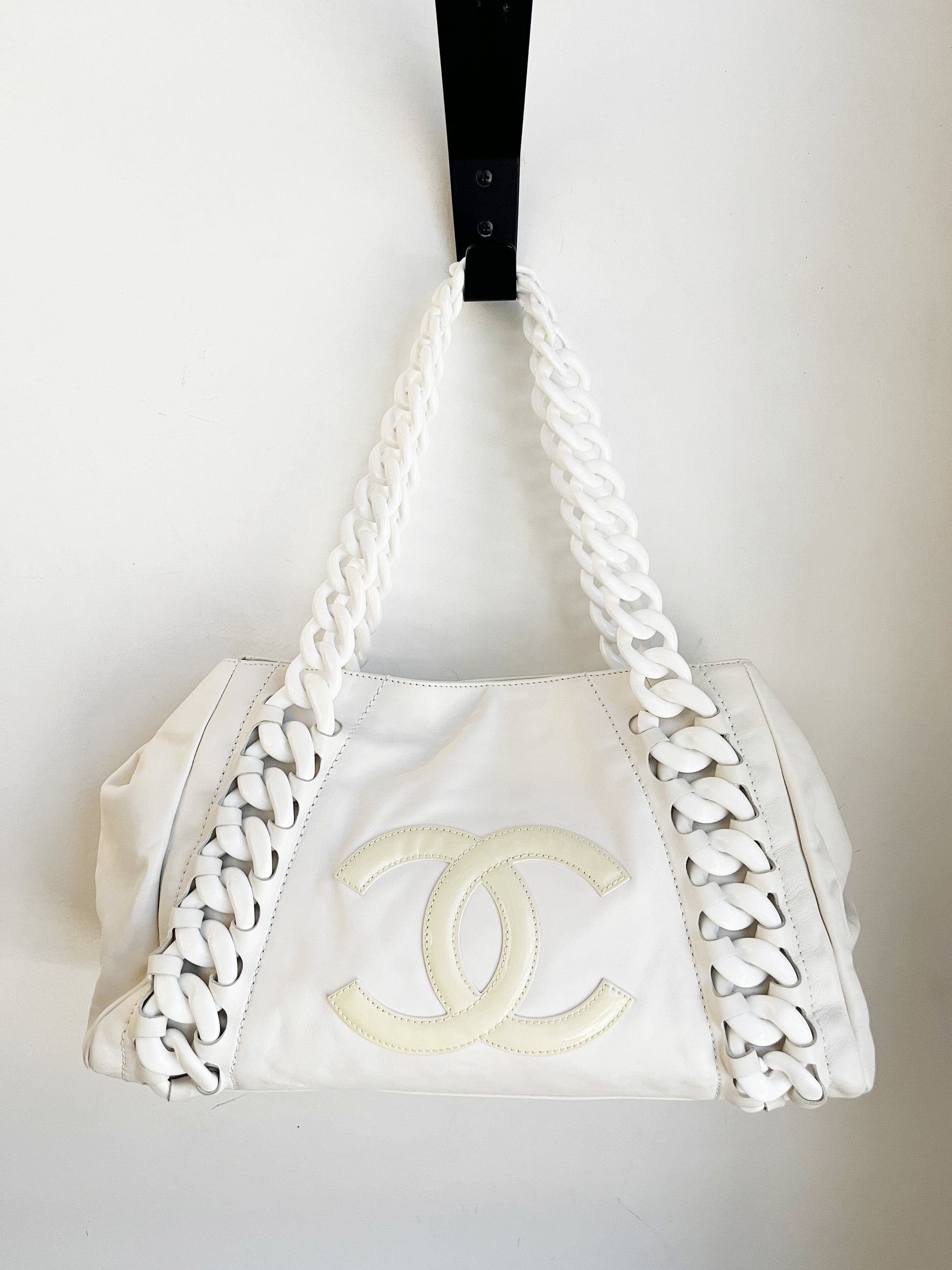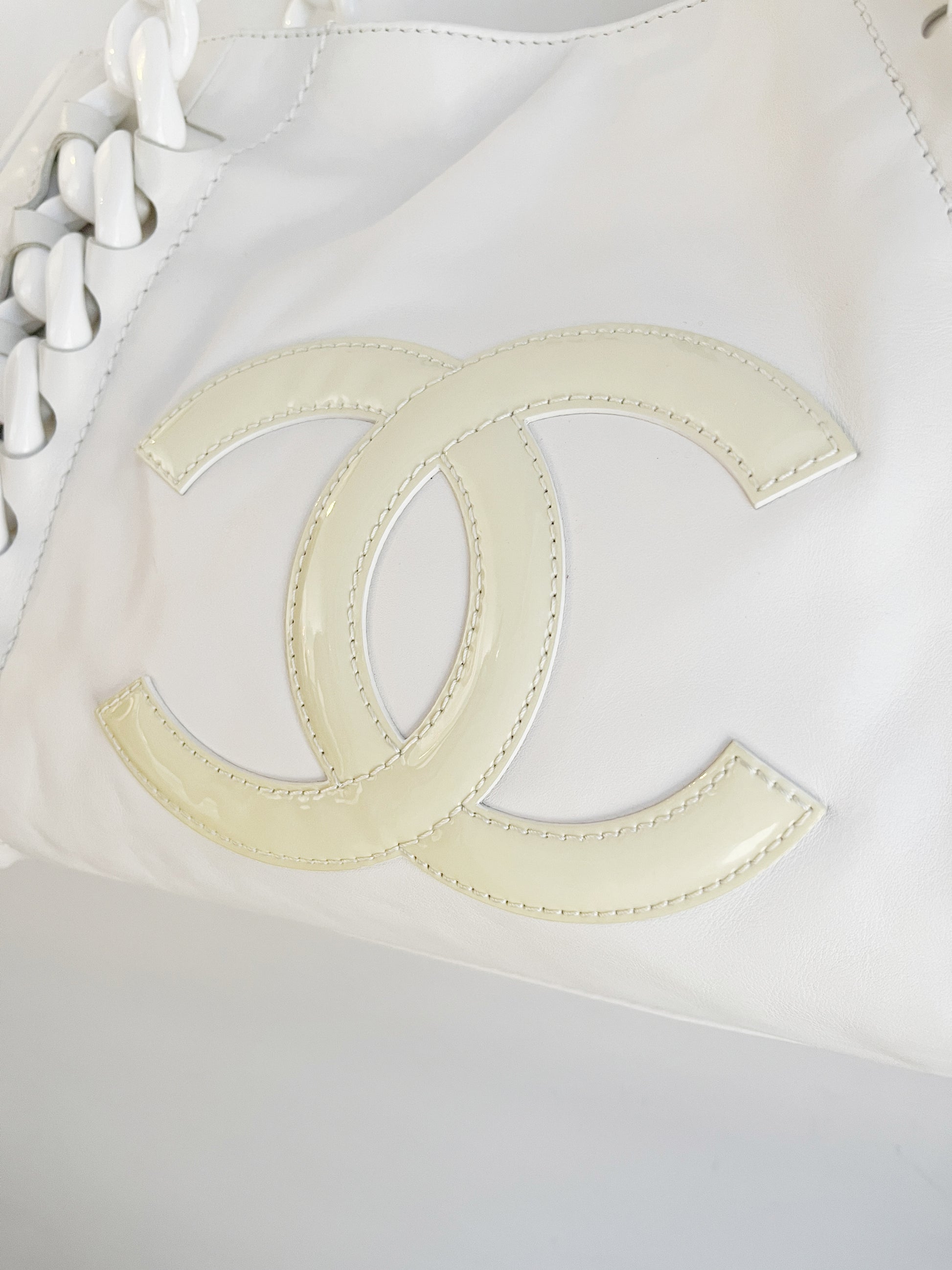 Oversized stitched interlocking patent leather "CC" emblazoned on the front