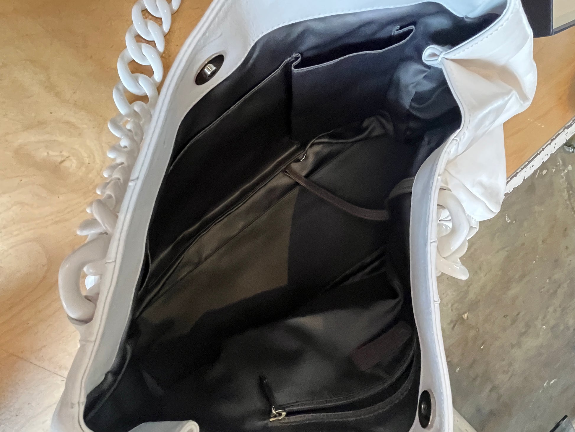 Large modern black Rhodoid plastic chain straps that are woven through the leather