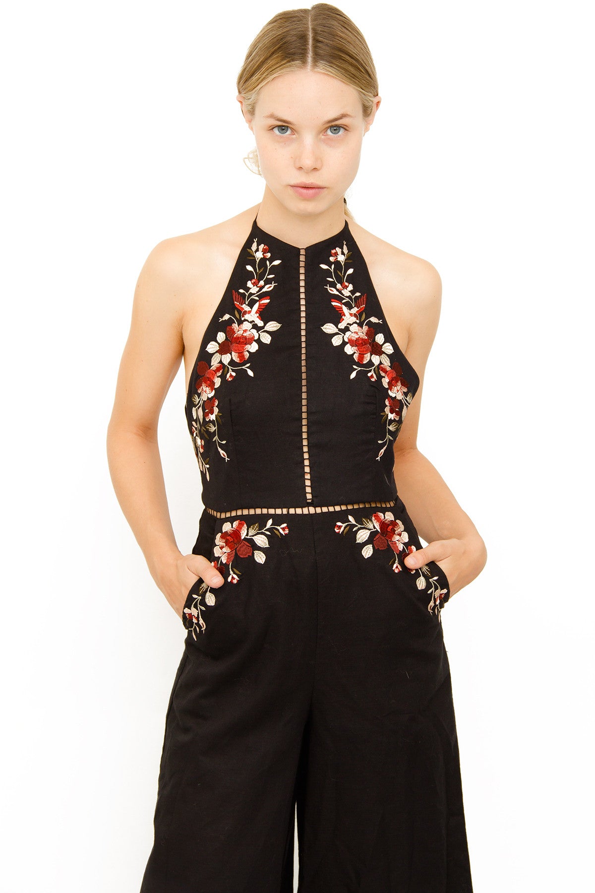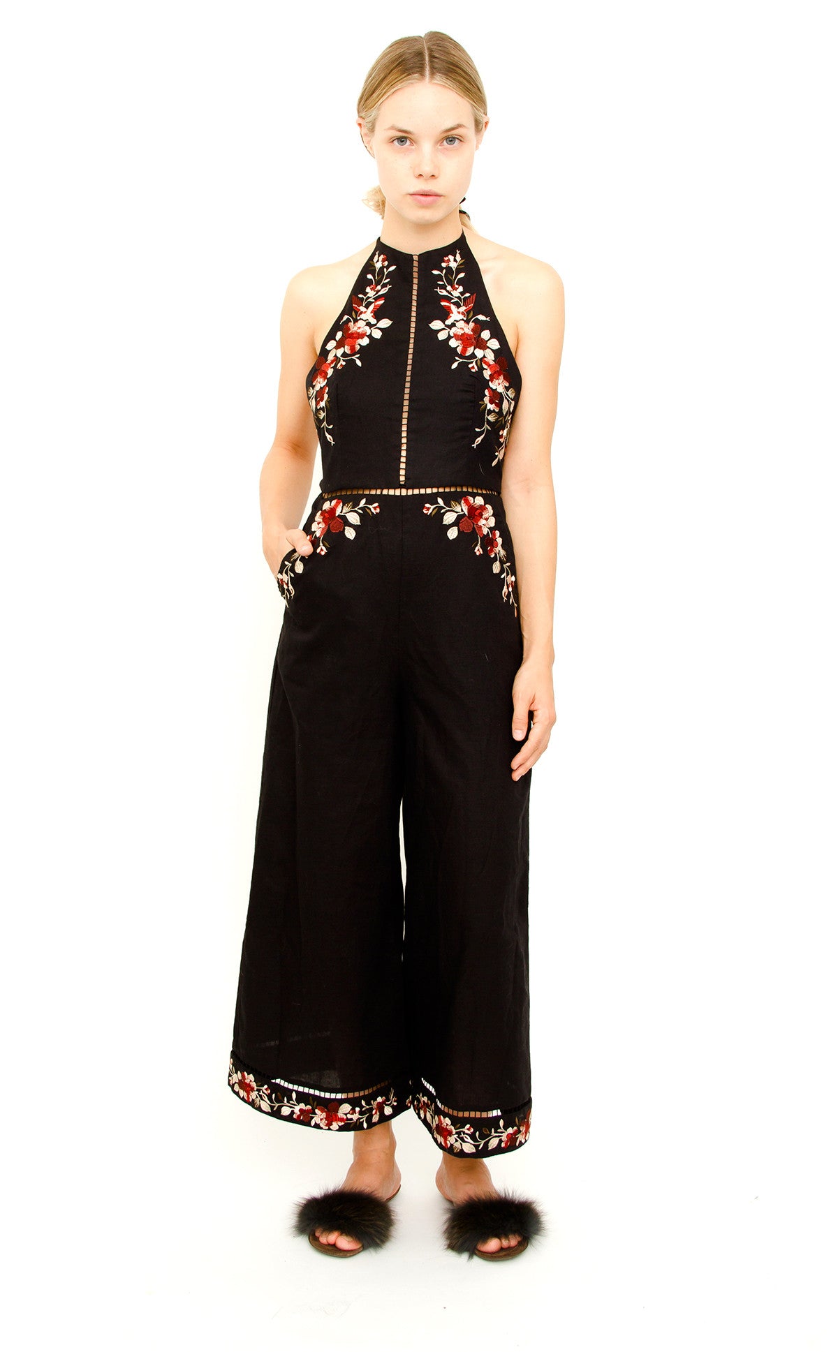 Length (Adjustable halter tie)-51.5" Bust-29" Waist-26" Hips-44" Inseam-24" Rise-13" Leg opening-27"